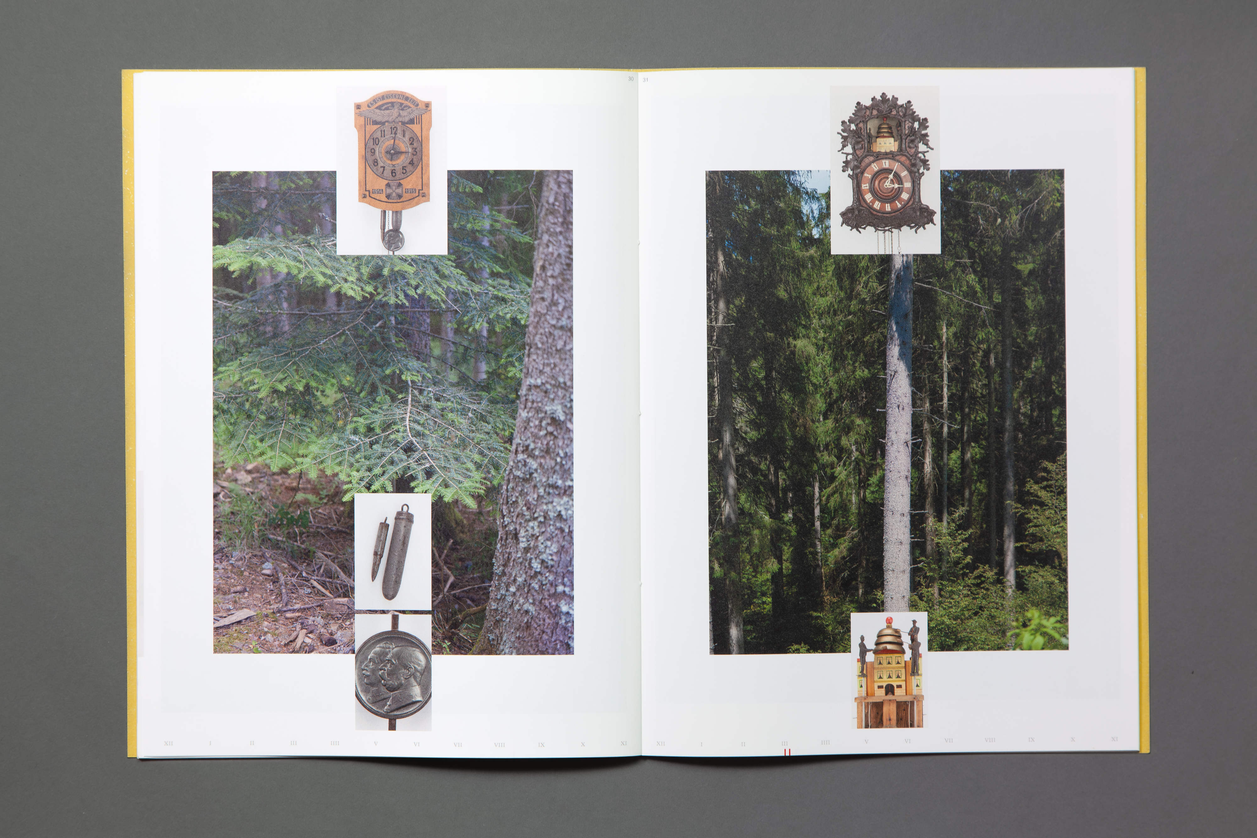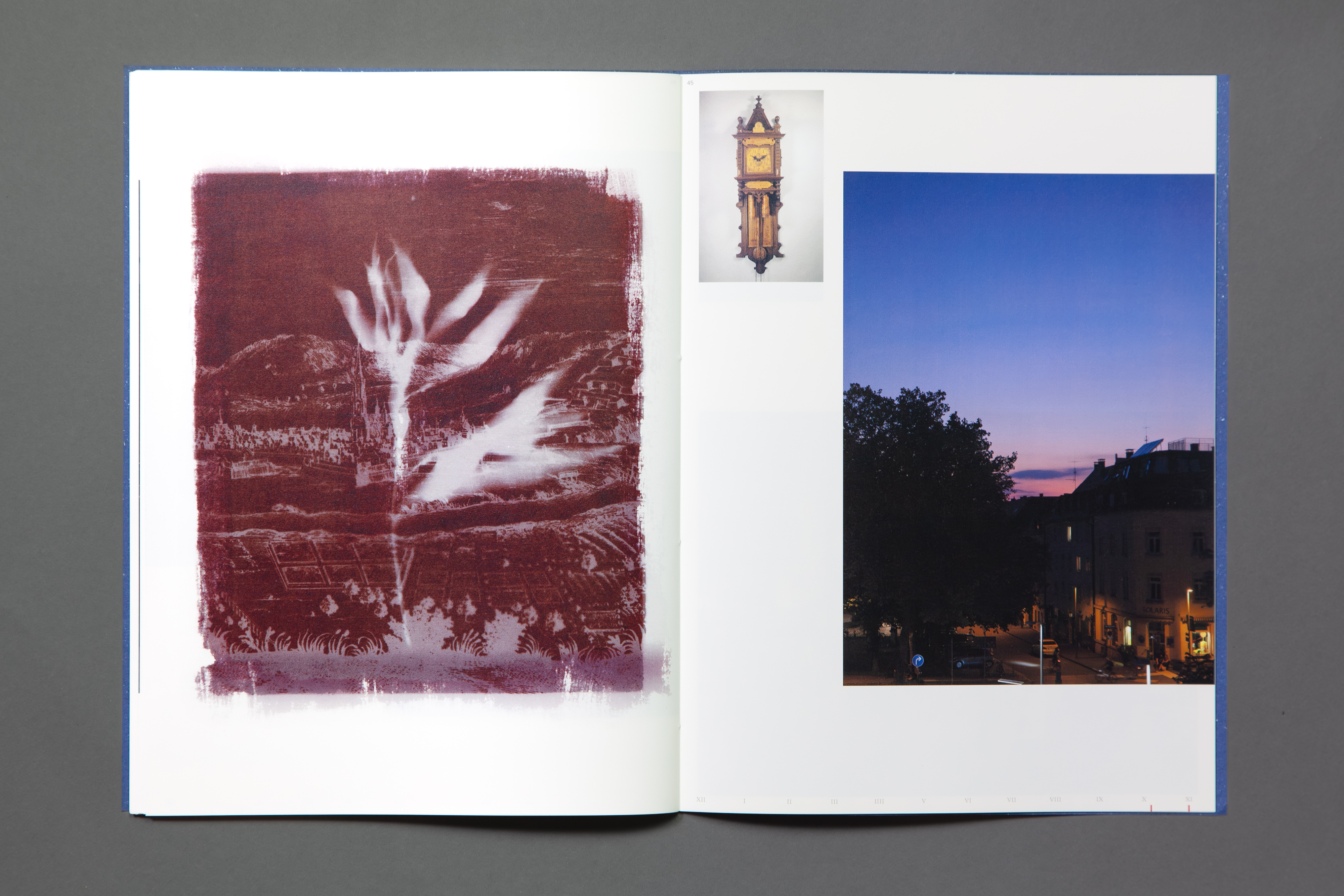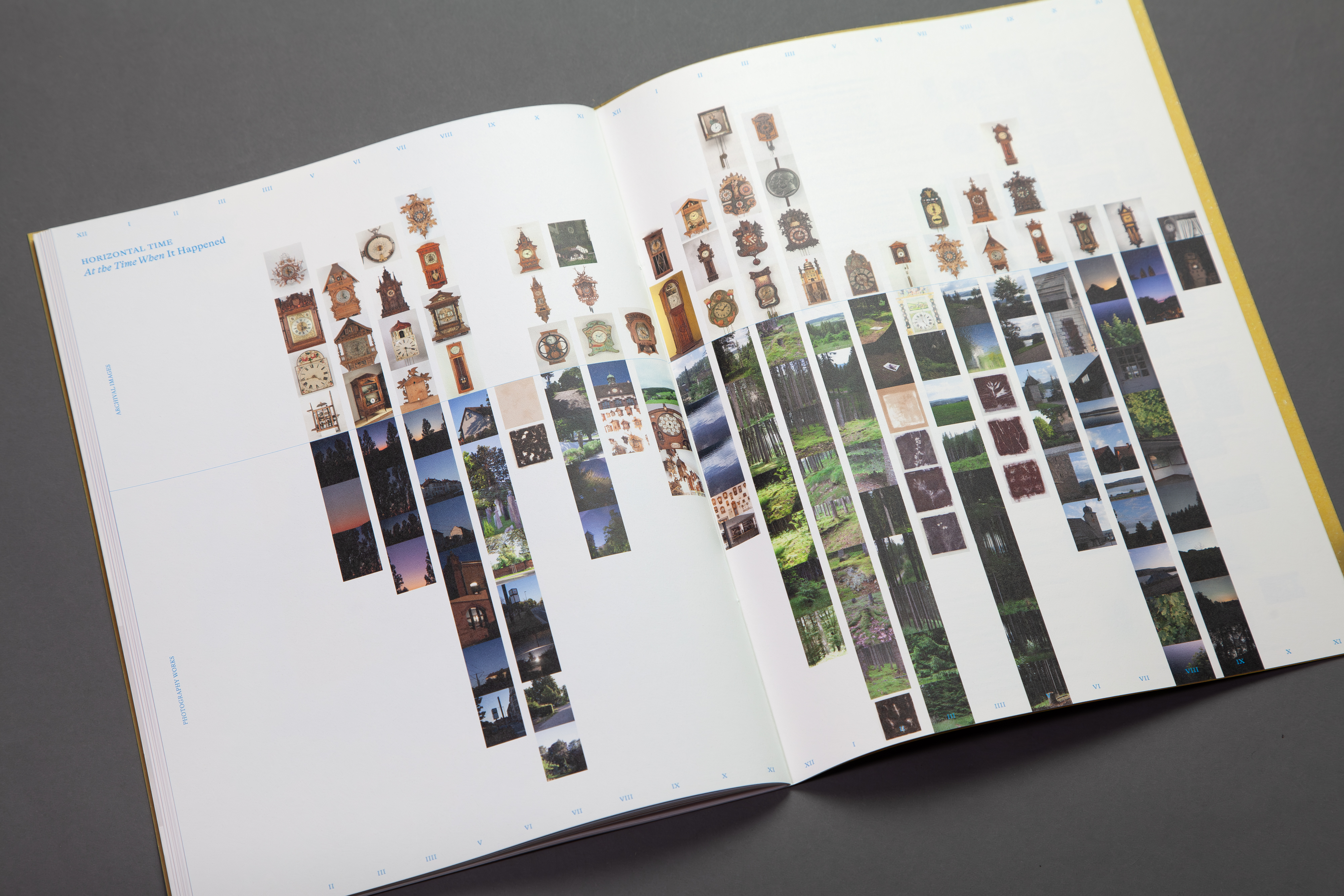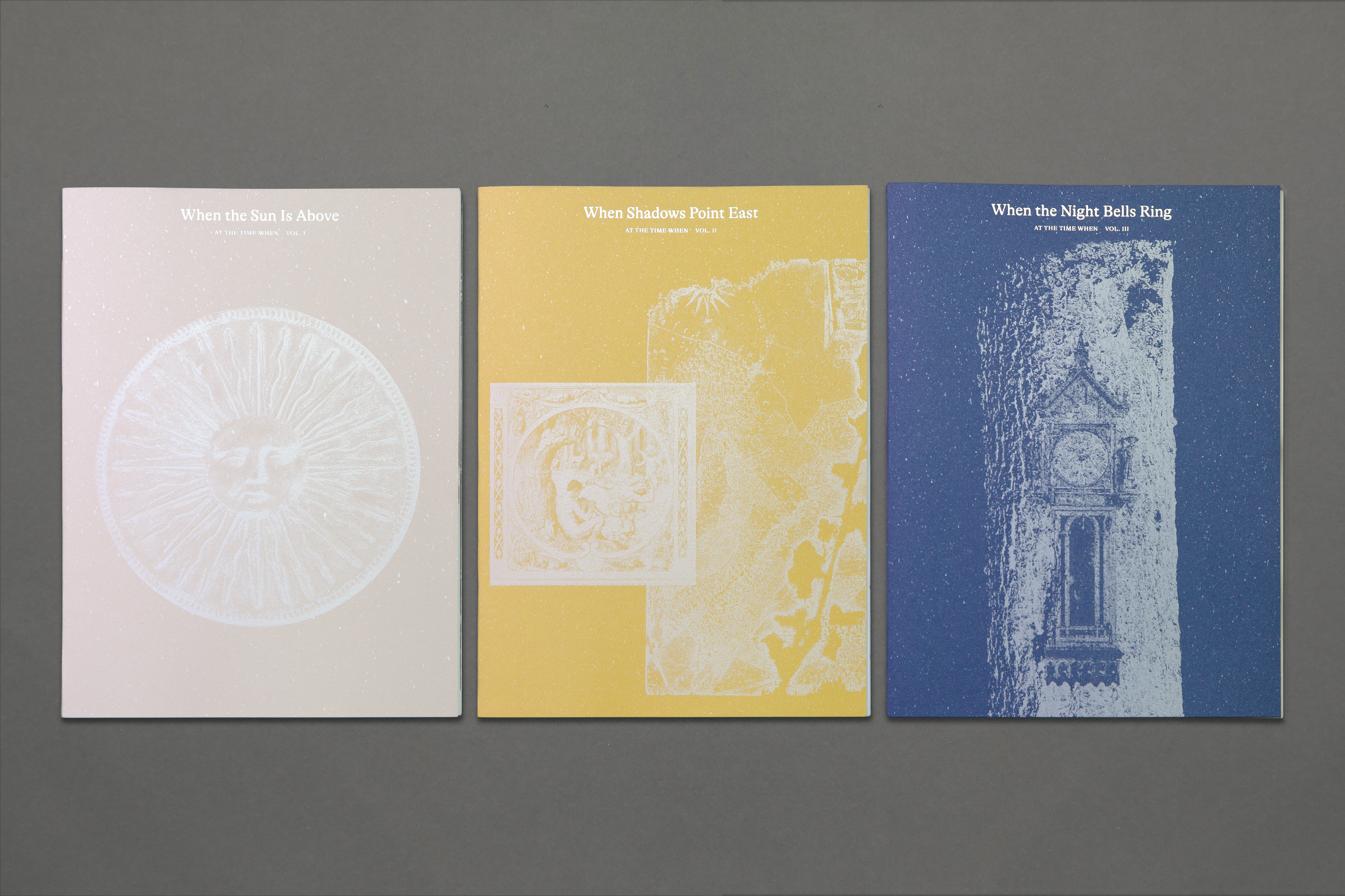At the Time When is a three-volume artist book dividing a day into three periods, tracing time from fluid natural markers—sun, shadows, combustion, to mechanical standardization that synchronized human rhythms and production. The work draws from two Black Forest archives, the German Clock Museum and Baden State Museum, where 17th-century clockmaking traditions persist amid thousands of timepieces frozen at disparate moments like 8:10 or 4:00. Captured during a June visit amid the year's longest days, these artifacts and images from varied pasts converge to probe humanity's temporal and eternal bonds with time.
